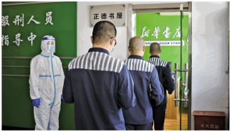 圖為鄧甲龍(左一)組織罪犯購書。 受訪者供圖