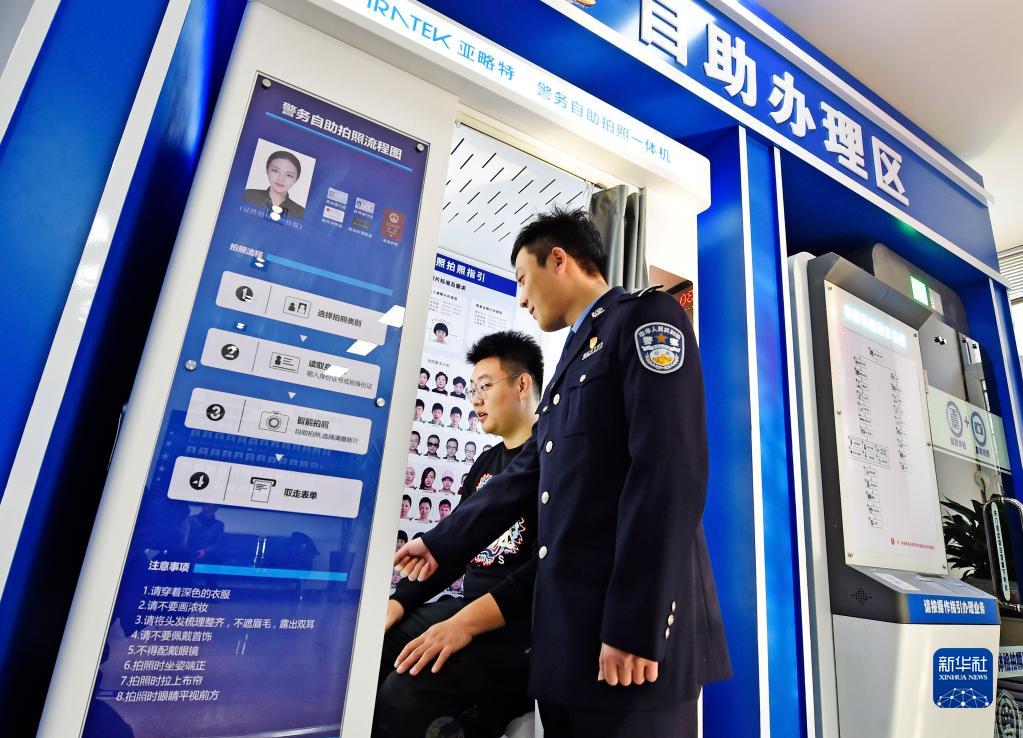 在遼寧省本溪市公安局北地派出所民警指導(dǎo)下,市民通過(guò)自助體檢機(jī)完成機(jī)動(dòng)車駕駛?cè)藱z測(cè)項(xiàng)目(2021年12月10日攝)。新華社發(fā)