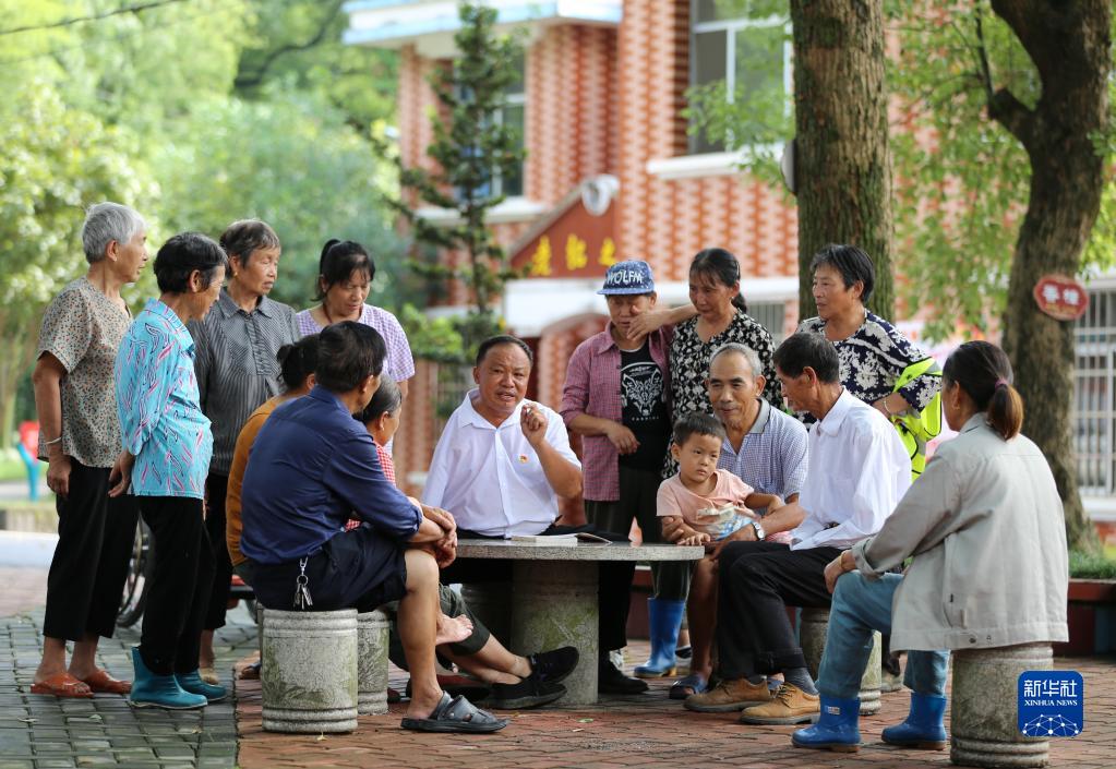 江西蘆溪縣宣風(fēng)鎮(zhèn)珠亭村人民調(diào)解員陽(yáng)昌紹(中)為珠亭村的百姓宣講民法典知識(shí)(2021年8月17日攝)。新華社記者 胡晨歡 攝