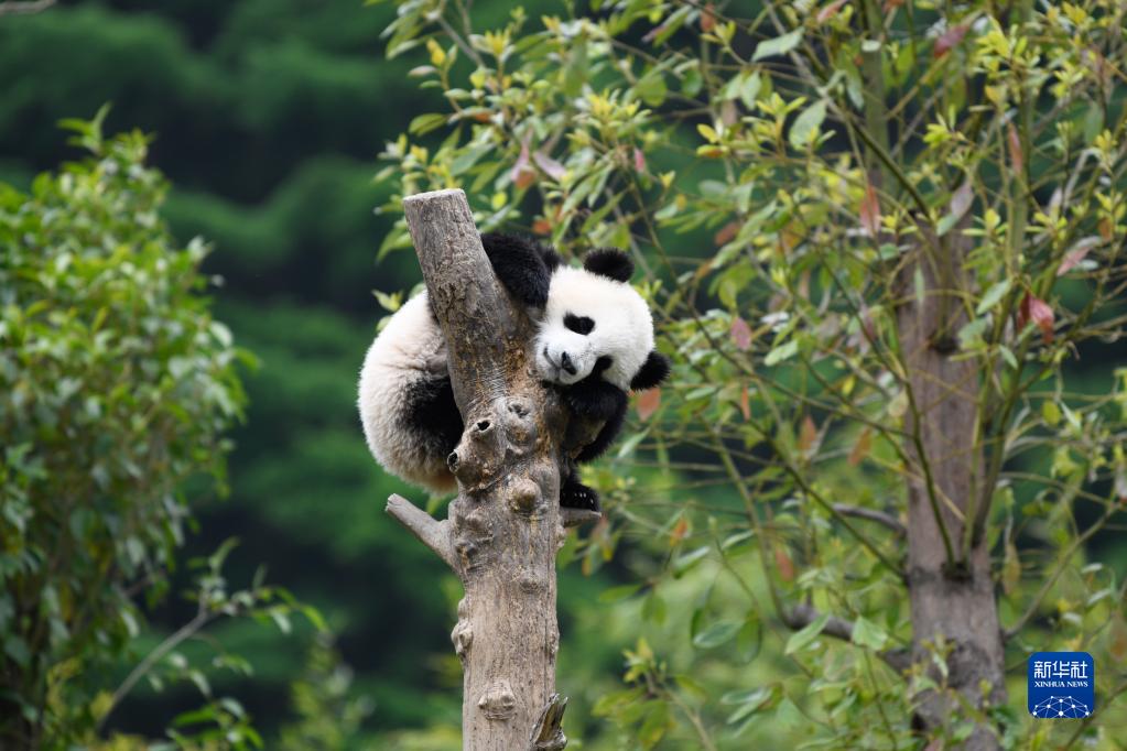在中國大熊貓保護(hù)研究中心臥龍神樹坪基地內(nèi),一只大熊貓在樹上休息(2022年4月24日攝)。 新華社記者 胥冰潔 攝