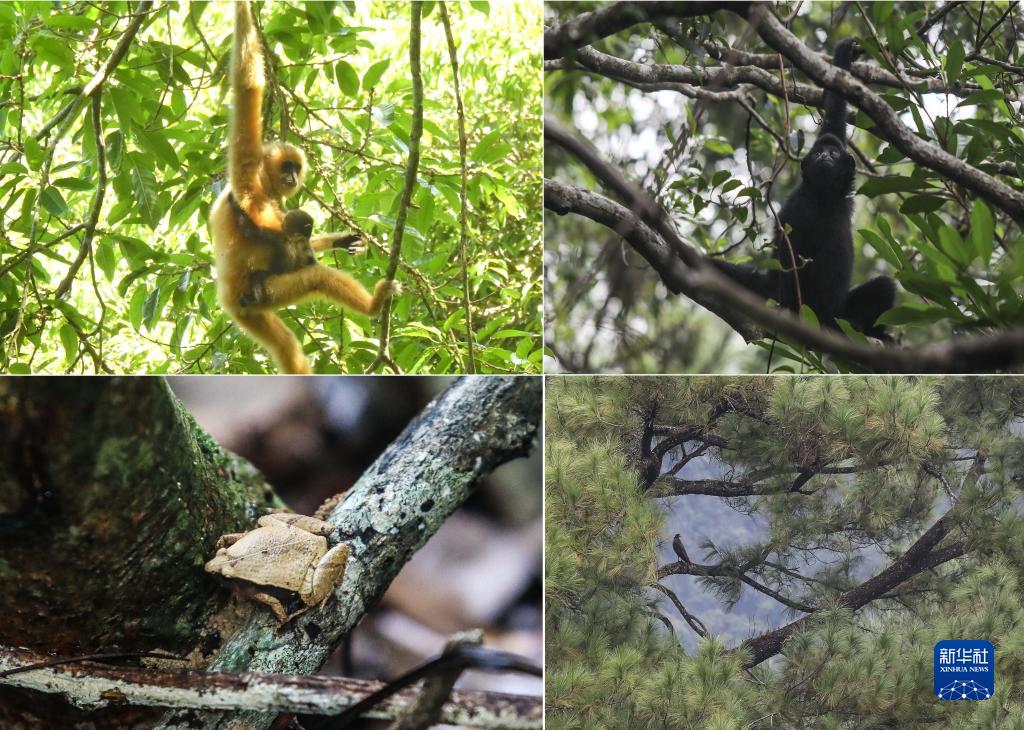 拼版照片:左上圖為2021年5月拍攝的海南長臂猿B群幼猿(海南熱帶雨林國家公園管理局供圖);右上圖為在海南熱帶雨林國家公園體制試點區(qū)霸王嶺自然保護(hù)區(qū)內(nèi)拍攝的海南長臂猿(2019年10月25日新華社記者蒲曉旭攝);左下圖為在霸王嶺自然保護(hù)區(qū)內(nèi)拍攝的姬蛙(2019年10月26日新華社記者蒲曉旭攝);右下圖為在霸王嶺自然保護(hù)區(qū)內(nèi)拍攝的蛇雕(2019年10月26日新華社記者蒲曉旭攝)。 新華社發(fā)